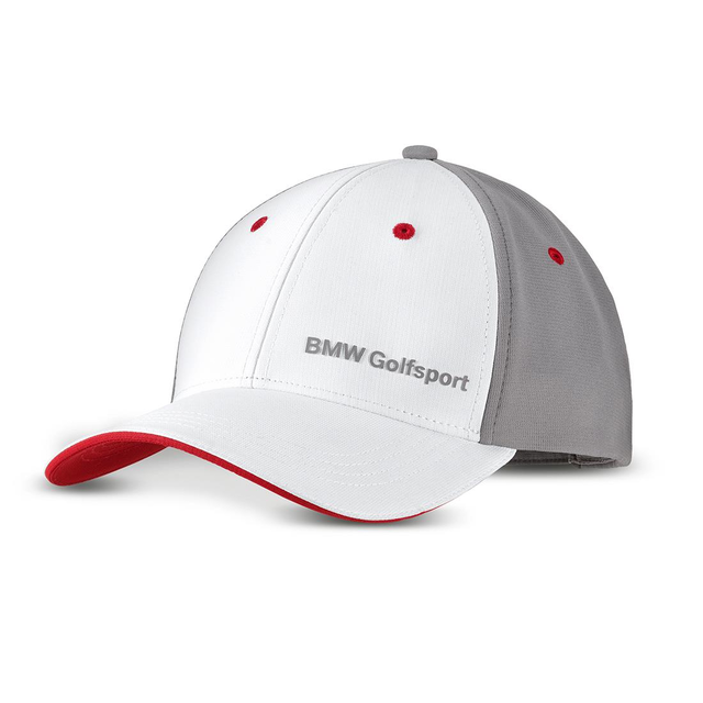 Golfsport Cap. Made of quick-drying material with UV protection and reinforced front panel. Sweat band made of grey mesh, six embroidered ventilation holes and stitching on the visor. Adjustable metal buckle with BMW logo engraving. Striped silicone flag label on back left opening.